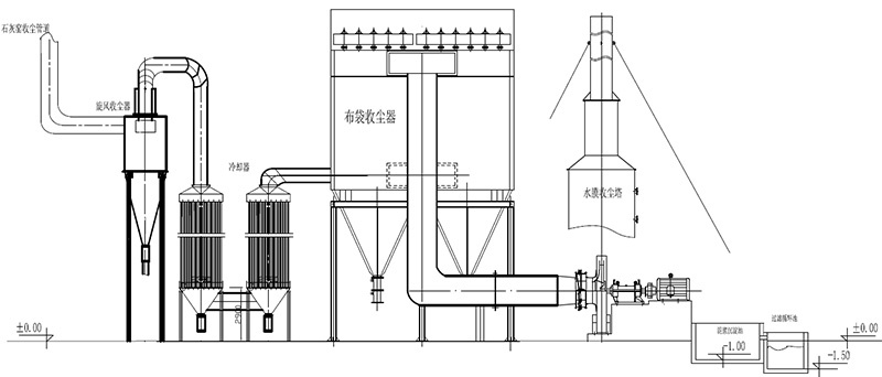 項(xiàng)目廢氣——→旋風(fēng)除塵器——→列管散熱器——→布袋收塵器——→引風(fēng)機(jī)——→脫硫塔——→干凈氣體排出